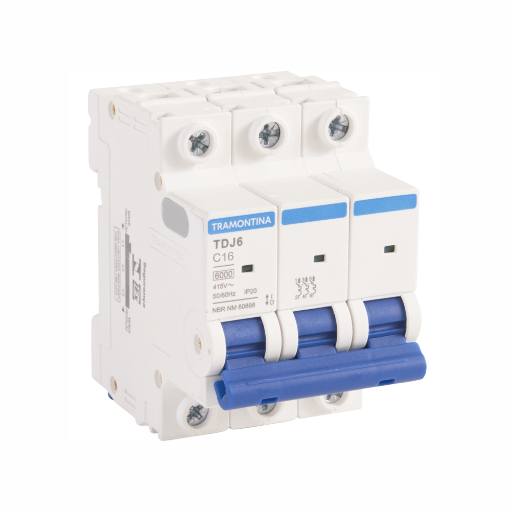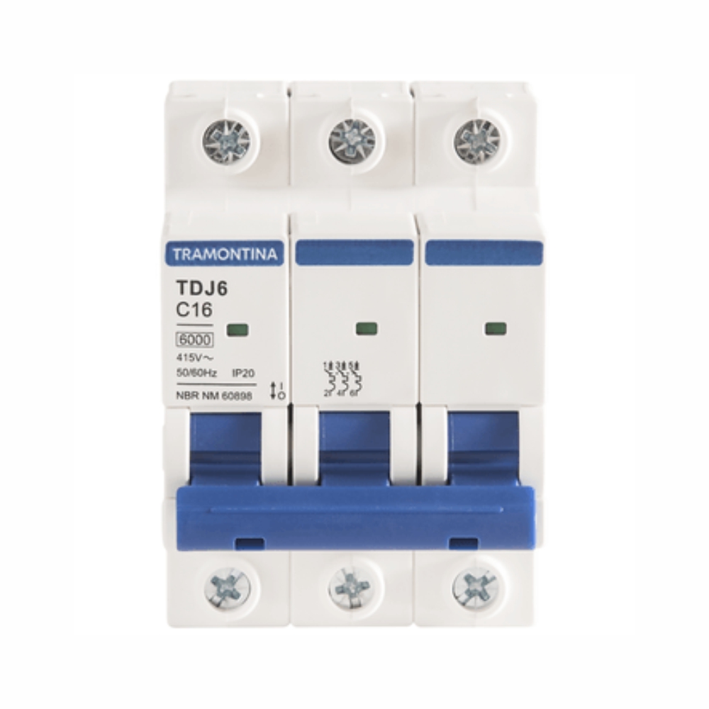 El mini disyuntor TDJ6 3 P 16 A 6 kA curva C Tramontina.Desarrollado para garantizar la seguridad de la instalación, preserva la red eléctrica y a sus equipos en caso de sobrecarga o cortocircuito.